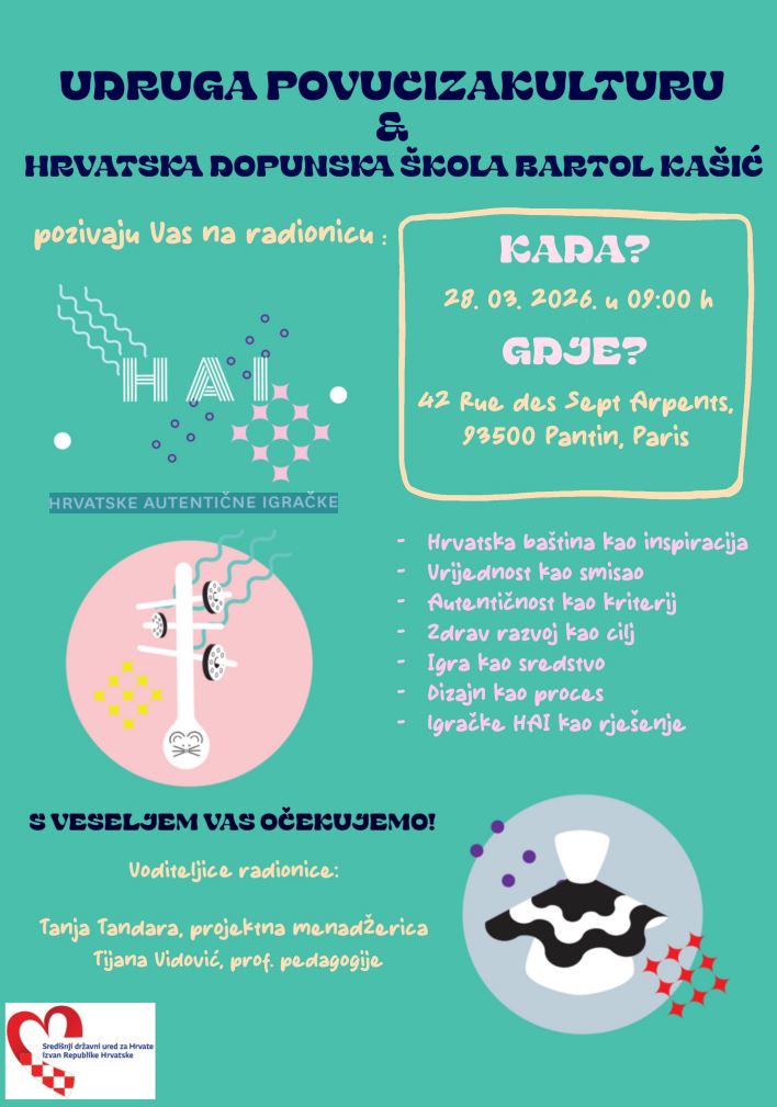 L’atelier, ouvert aussi bien aux enfants, qu’aux adultes, sera animé par deux invitées de Zagreb, Mmes Tanja Tandara et Tijana Vidović qui ont déjà présenté cet atelier aux communautés croates dans plusieurs pays d’Europe et du monde.
