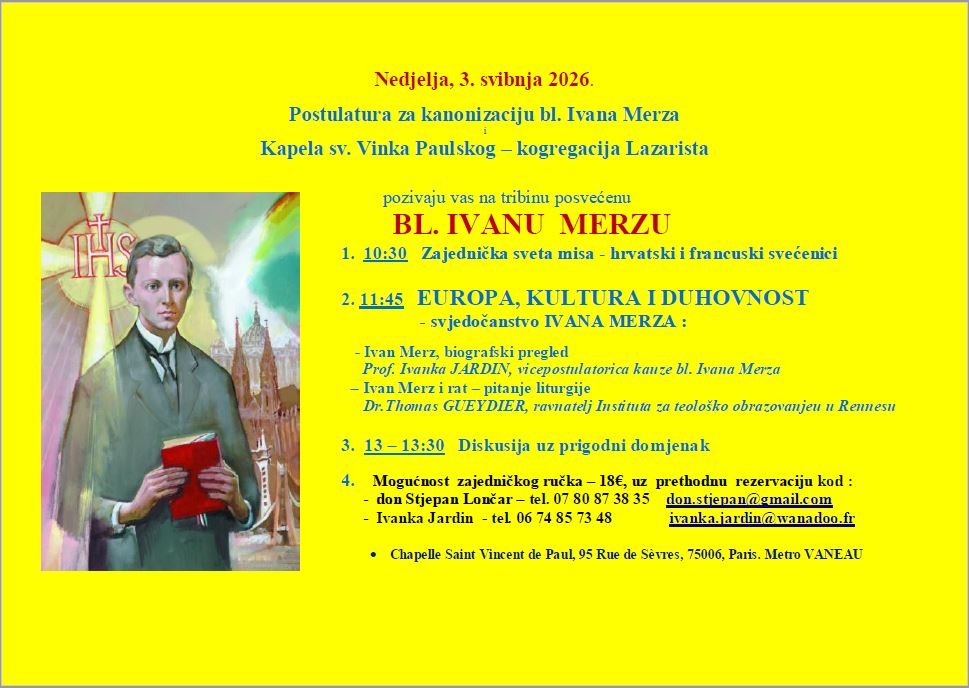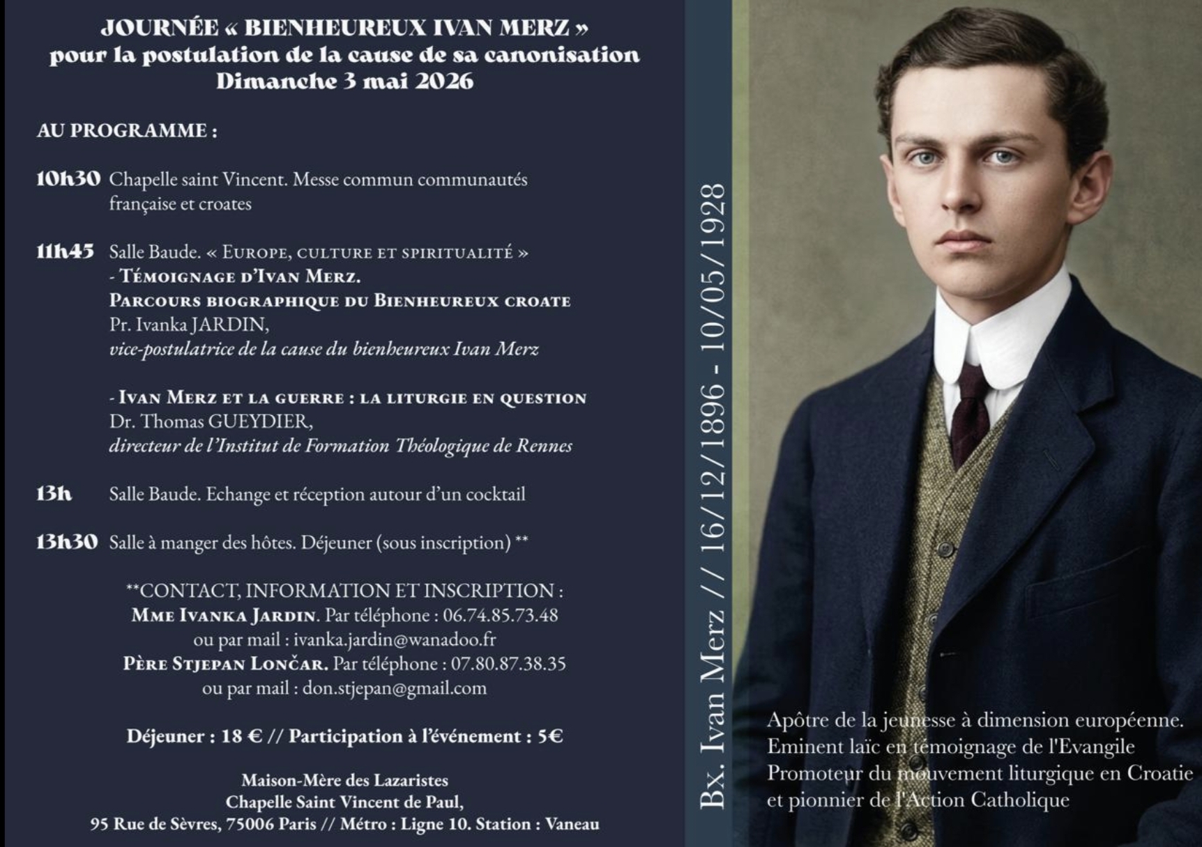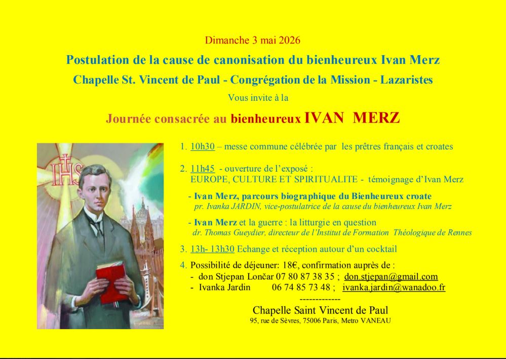 Journée « Bienheureux Ivan MERZ » Date 03 Mai 2026 Heure 10 h 30 min Lieu Eglise Saint-Vincent-de-Paul - Paris 95, rue de Sèvres - 75006 Paris Catégorie A afficher Organisateur Don Stjepan LONČAR Téléphone 07.80.87.38.35 Email don.stjepan@gmail.com Autres organisateurs Ivanka JARDIN Téléphone 06.74.85.73.48 Email ivanka.jardin@wanadoo.fr