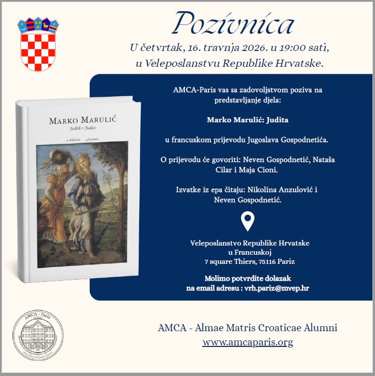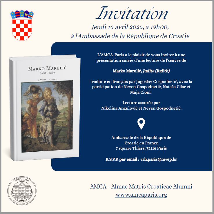 Présentation de l’œuvre de Marko Marulić Date 16 Avr 2026 Heure 19 h 00 min Lieu Ambassade de la République de Croatie en France - Paris 7, square Thiers - 75016 Paris Catégorie A afficher Organisateur AMCA Email amcaparis@gmail.com Site Web https://www.amcaparis.org