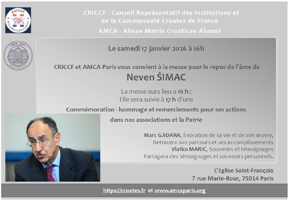 Hommage à Neven Šimac Date 17 Jan 2026 Expired! Heure 16 h 00 min Lieu Eglise Saint-François 7, rue Marie-Rose - 75014 Paris Organisateur CRICCF-CMCF Email infos@croates.fr Site Web https://www.croates.fr Autres organisateurs AMCA Email amcaparis@gmail.com Site Web https://www.amcaparis.org