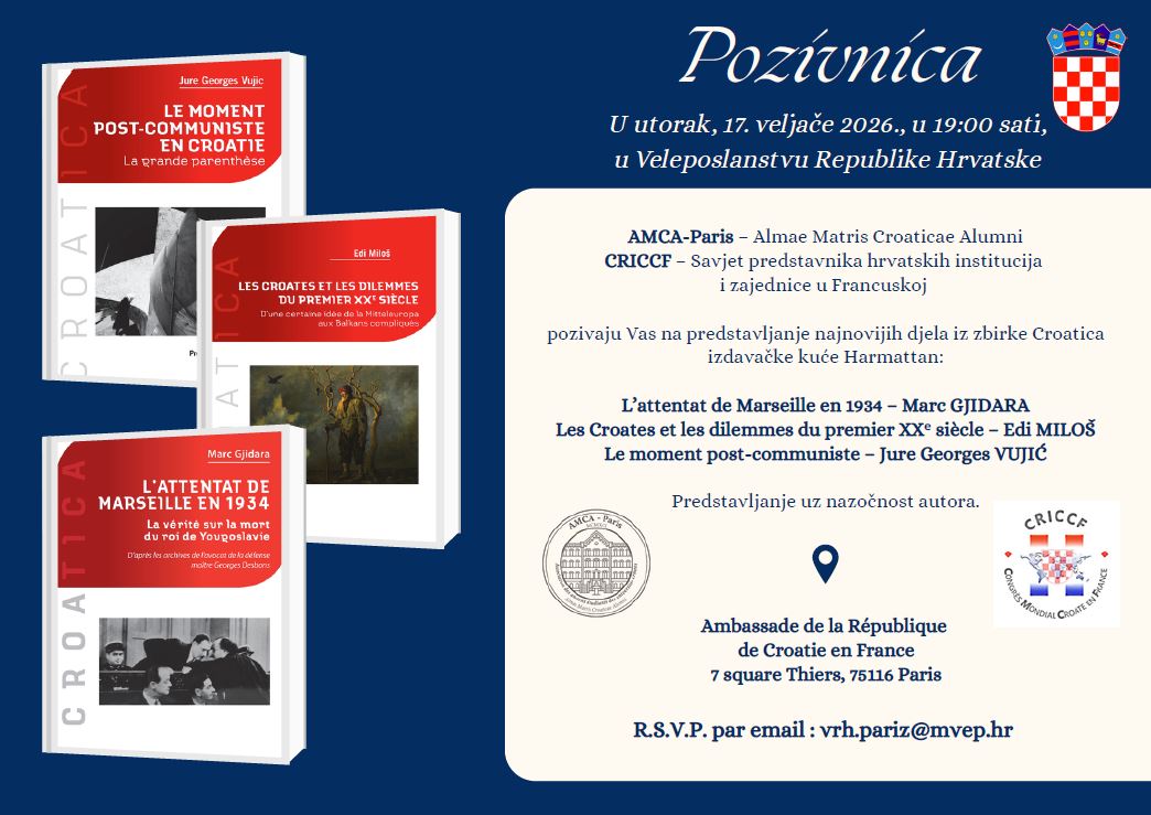 Présentation des ouvrages de la Collection Croatica Date 17 Fév 2026 Heure 19 h 00 min Lieu Ambassade de la République de Croatie en France 7, square Thiers - 75016 Paris Organisateur Ambassade de Croatie en France Email rsvp.paris@mvep.hr Site Web https://mvep.gov.hr/fr/fr